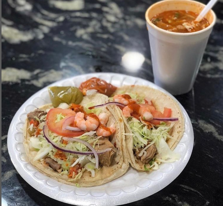 Corn tortillas, shrimp, fish, cabbage, onions, cilantro.